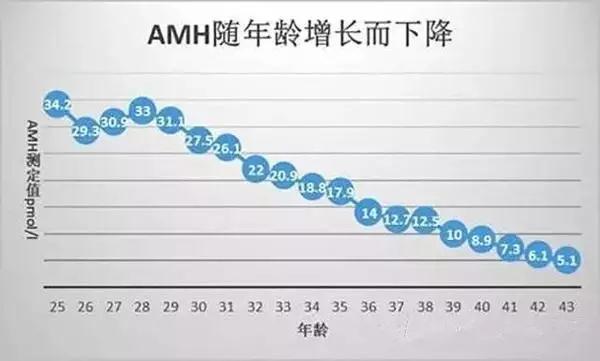 从图中可以看出,女性35岁之后的AMH值便急速下降,尤其35岁以后变化最快,40岁之后的AMH值,甚至每个月都在变化,卵巢已经拉警报了!