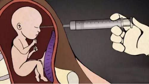 手术进行时:引产妇女进入手术准备室,脱掉上衣后进入手术室,躺在手术台上,两腿分开并固定在支架上;然后用一个穿刺针将100毫克的药物,经过母体的腹壁,注入羊胎膜里面,就可以在36小时内发动宫缩,将胎儿排出来。